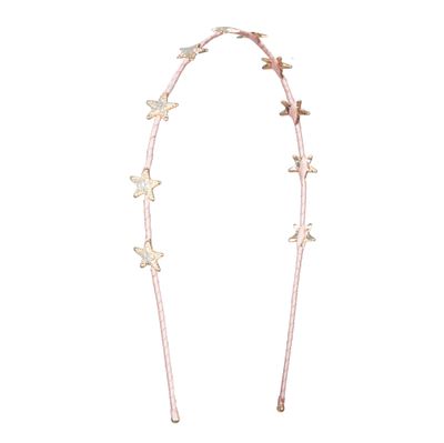 Soft pink satin ribbon wrapped alice band adorned with ten sparkly gold and silver stars